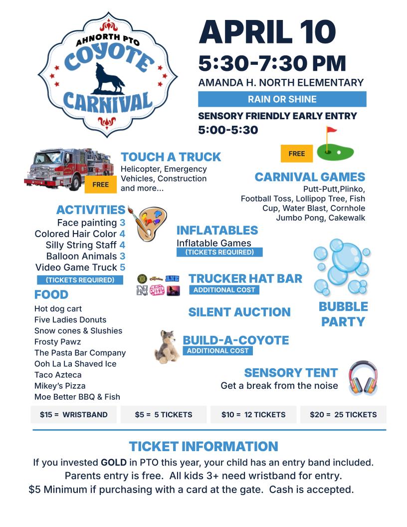 The Coyote Carnival is a fun-filled evening for ANE families featuring carnival games, exciting activities, amazing prizes, food trucks, and community vehicles. Bring the whole family and join us for an unforgettable night of fun, laughter, and school spirit!